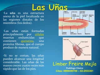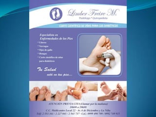 El documento proporciona información sobre varias condiciones y enfermedades de las uñas y los pies, incluidas las uñas encarnadas, los hongos de las uñas, los callos, el pie diabético y otros problemas comunes. También describe los tratamientos recomendados para estas afecciones, que incluyen el uso de medicamentos, plantillas, cirugía y la consulta con un podólogo. El documento enfatiza la importancia de la higiene adecuada de los pies y el uso de calzado correcto para prevenir problemas