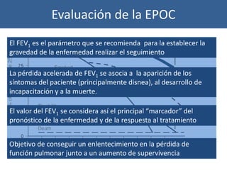 Este documento discute la evaluación y tratamiento de la EPOC. Resalta que el FEV1 es el parámetro principal para evaluar la gravedad de la enfermedad pero que los síntomas como la disnea son más importantes para los pacientes. También enfatiza la importancia de evaluar la variabilidad de los síntomas y la respuesta a los tratamientos mediante cuestionarios de calidad de vida y síntomas.