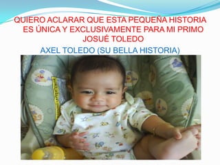 Este documento narra la historia de Axel Toledo, un niño diagnosticado con autismo. Aunque su maestra y madre estaban preocupadas inicialmente por su comportamiento, la Dra. Corazón determinó que Axel en realidad tenía un "corazón de artista" y podía vivir en dos mundos diferentes. Recomendó que la familia le diera a Axel "el frasco del amor" a diario, o sea el amor incondicional de su familia. Gracias a esto, Axel pudo desarrollarse plenamente, convertirse en el mejor doctor del mundo