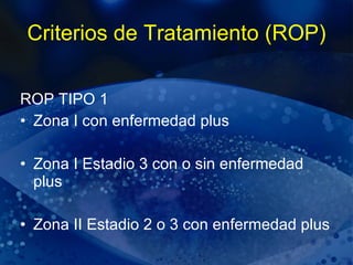 El documento describe los criterios de tratamiento y opciones terapéuticas para la retinopatía de la prematuridad (ROP), incluyendo láser, crioterapia, fármacos antiangiogénicos como bevacizumab y ranibizumab. También discute estudios clínicos en curso que evalúan el uso de anti-VEGF como tratamiento primario o adjunto al láser en casos graves de ROP.