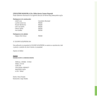 El documento presenta el trabajo del consultorio municipal de la Dra. Edilicia Barrios Campos, que se ha especializado en responder consultas sobre gestión municipal, participación ciudadana y planificación participativa durante más de siete años. Además, se ofrece un compendio de preguntas frecuentes que buscan facilitar la comprensión y el uso de información para fortalecer la democracia en el ámbito local. La publicación incluye diversas secciones que abordan temas como la autonomía, la legislación municipal, la planificación y la gestión social, con un enfoque en promover una mayor inclusión y calidad de vida en las comunidades.
