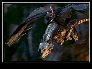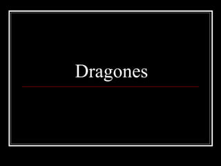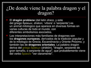 El documento habla sobre los dragones. Explica que la palabra dragón proviene del latín y griego y se refiere a serpientes o víboras. Los dragones aparecen en muchas culturas y mitologías con diferentes significados. También menciona la película Eragon, basada en la novela del mismo nombre, que trata sobre un joven que descubre un huevo de dragón.