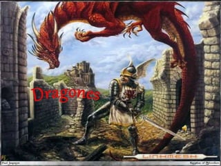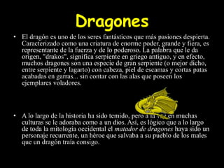 El documento describe las características y representaciones de los dragones en diferentes culturas. En Europa, los dragones eran representados como criaturas que escupían fuego, envenenaban aguas y raptaban doncellas, mientras que en Asia se les veneraba como deidades benevolentes que traían lluvia y fertilidad. Además, los dragones a menudo aparecían en emblemas militares para simbolizar fuerza y valentía en la batalla.