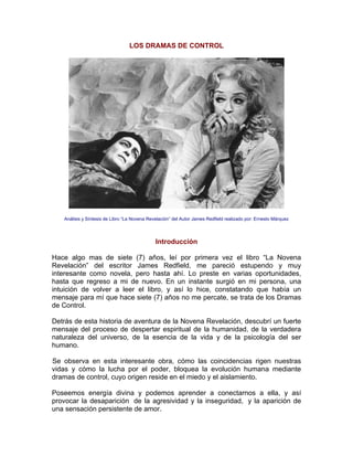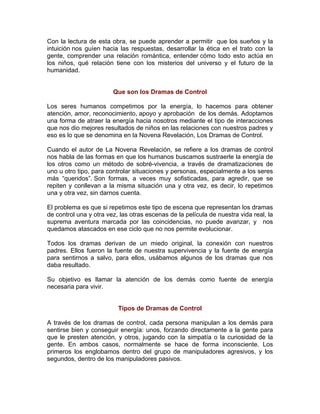 Este documento resume el libro "La Novena Revelación" y explica los conceptos de "Dramas de Control". Los Dramas de Control son formas en que las personas buscan atraer la atención y energía de otros a través de dramatizaciones inconscientes, como intimidación, interrogación, distanciamiento o asumir un rol de víctima. El documento describe estos cuatro tipos principales de Dramas de Control, cómo funcionan, y cómo a menudo se aprenden en las relaciones familiares en la infancia.