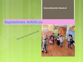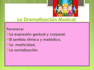 La dramatización musical favorece la expresión corporal y gestual, el sentido rítmico y melódico, la motricidad y la socialización en los infantes en edad inicial. También constituye un espacio para analizar aspectos como las intenciones del autor, las palabras utilizadas y el mensaje desde una perspectiva crítica, así como evaluar su utilidad didáctica según las áreas de formación. La dramatización musical es un recurso al alcance de los docentes y estudiantes en la etapa inicial.