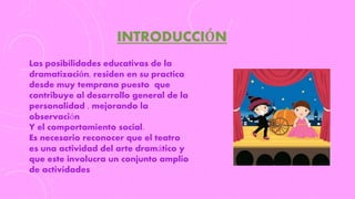 La dramatización mejora el desarrollo del lenguaje oral en los niños de 3 años. La dramatización es una técnica educativa que contribuye al desarrollo de la personalidad y las habilidades sociales y de observación de los niños. Involucra actividades como la imaginación, originalidad, sensibilidad y flexibilidad. Algunos tipos de dramatización son la improvisación, la pantomima y el uso de títeres. Representa situaciones y resuelve problemas de manera lúdica.
