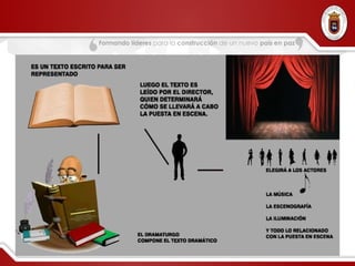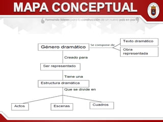 Este documento define la escritura dramática y su estructura. Explica que el drama viene de la palabra griega que significa "hacer" y se asocia con la acción. Un texto dramático presenta diálogos entre personajes sin narración, y está diseñado para ser representado no solo leído. Detalla que un acto dramático tiene una estructura con desarrollo de acontecimientos y orden formal para contar la historia.