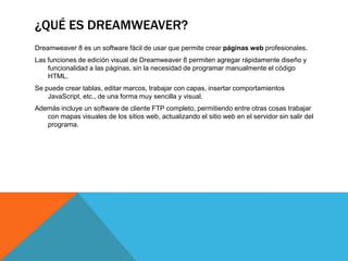 Dreamweaver 8 es un software fácil de usar para crear páginas web profesionales sin necesidad de programar código HTML manualmente. Sus funciones de edición visual permiten agregar rápidamente diseño y funcionalidad a las páginas mediante la creación de tablas, marcos, capas y comportamientos JavaScript de forma sencilla. Además, incluye herramientas de FTP para transferir archivos al servidor web sin salir del programa.