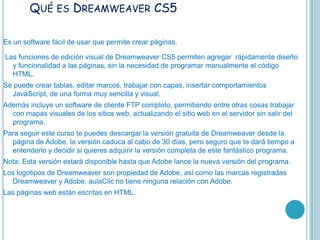 Dreamweaver es un software para crear y editar páginas web de forma visual sin necesidad de codificar a mano. Incluye funciones como la edición de tablas, marcos y capas de forma sencilla. La nueva versión mejora la compatibilidad con sistemas de gestión de contenido y permite inspeccionar fácilmente los estilos CSS aplicados. Para publicar una página se requiere contratar hosting y un dominio con una empresa que ofrezca servidores con espacio en la web.
