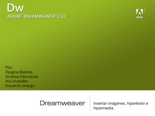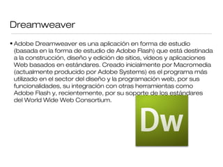 Dreamweaver es una aplicación de Adobe para crear y editar sitios web que permite insertar imágenes, hipertexto e hipermedia. El hipertexto son palabras o frases resaltadas que al hacer clic llevan a otra página web enlazándolas. Para crear un hipertexto se selecciona el texto, se inserta un hipervínculo y se ingresa la dirección a la que apunta. Las imágenes mejoran la apariencia de una página y se pueden insertar fácilmente en Dreamweaver. La hipermedia integra diferentes medios