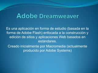 Adobe Dreamweaver es una aplicación para crear y editar sitios y aplicaciones web basados en estándares. Fue creado originalmente por Macromedia y ahora es producido por Adobe Systems. Dreamweaver permite previsualizar páginas web usando los navegadores instalados y tiene herramientas para principiantes como buscar y reemplazar texto en sitios web.