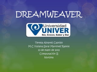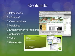 Dreamweaver es un software para crear páginas web de forma profesional y visual sin necesidad de programar código manualmente. Ofrece características como edición de HTML, PHP y CSS de forma sencilla, conexión FTP para editar archivos en un host, plantillas predefinidas y complementos para sistemas como Joomla. Dreamweaver es más completo que FrontPage y su programación resulta en estructuras limpias y siguiendo estándares web.