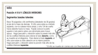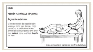 El drenaje postural es una técnica que utiliza la gravedad para movilizar secreciones en el sistema respiratorio infantil, combinando posiciones, percusión y vibración. Se deben considerar contraindicaciones como fibrosis quística y procesos infecciosos pulmonares, y se recomienda realizar sesiones de fisioterapia respiratoria de 20 a 40 minutos. Es esencial seguir recomendaciones específicas para evitar complicaciones y maximizar la efectividad del tratamiento.