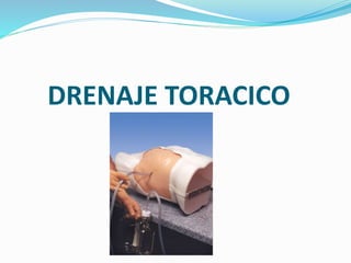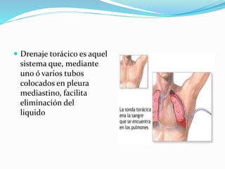 El documento describe el procedimiento de drenaje torácico. Este sistema utiliza uno o más tubos colocados en la pleura o mediastino para eliminar líquidos o gases de la cavidad torácica. El drenaje torácico se indica para evacuar depósitos de fluidos o para evitar su acumulación después de una cirugía torácica. El objetivo es facilitar la remoción de líquido, sangre y aire del espacio pleural o mediastino y restaurar la presión negativa del espacio pleural.
