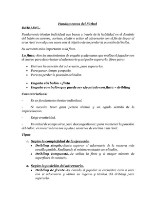 El documento resume los fundamentos técnicos individuales del fútbol como el dribbling, el cabeceo, los saques y el toque del balón. Explica que el dribbling busca sortear adversarios mediante la habilidad y la finta para avanzar hacia el arco rival. Describe los diferentes tipos de cabeceo y saques y explica cómo se debe golpear correctamente el balón con diferentes partes del cuerpo como los pies, rodillas, muslos, pecho, hombros y cabeza.