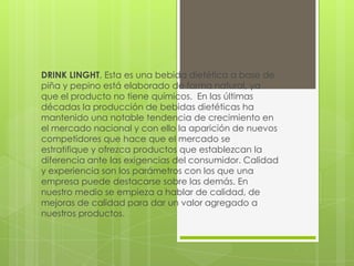 Este documento describe una bebida dietética a base de piña y pepino llamada DRINK LIGHT. Explica que es una bebida natural sin químicos que ayuda con la pérdida de peso, la digestión y la salud de la piel. También describe los orígenes y propiedades nutricionales de la piña y el pepino, así como los planes de distribuir el producto en las localidades de Miranda y Colina en el estado de Falcón, Venezuela.