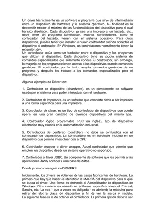 Un driver es un software que permite la comunicación entre un dispositivo de hardware y el sistema operativo, traduciendo los comandos genéricos del sistema operativo a comandos específicos para el dispositivo. Los drivers más comunes son los controladores de impresora, teclado y otros periféricos, pero se requiere un driver diferente para cada tipo de dispositivo. Los drivers se obtienen típicamente de los fabricantes de hardware y se instalan para permitir el uso de nuevos dispositivos conectados al computador.