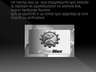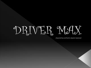 Driver Max proporciona pestañas para diferentes acciones y servicios como actualizar controladores, escanear controladores instalados y disponibles, obtener detalles del hardware, y crear y restaurar copias de seguridad de controladores. Permite verificar si hay versiones actualizadas de controladores, crear un registro de componentes de hardware y controladores, y exportar e importar copias de seguridad de controladores.