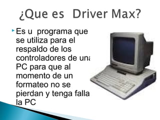 Driver Max es un programa que realiza respaldos de los controladores de una PC para evitar fallas en caso de formateo. El programa escanea los controladores instalados, identifica hardware faltante y permite descargar actualizaciones desde los sitios de los fabricantes. Driver Max también reporta información del sistema como la versión de Windows y especificaciones hardware. Al descargar e instalar el programa, este guía al usuario en la selección y respaldo de los controladores en un dispositivo externo.