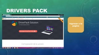 Este documento explica dos métodos para instalar drivers en una computadora: 1) Descargando un paquete de drivers que contiene todos los drivers necesarios, o 2) Descargando drivers individuales directamente desde el sitio web del fabricante de la computadora. Para el primer método, se requiere acceso a Internet o descargar una imagen ISO de 10.2 GB con todos los drivers. Para el segundo método, se debe buscar el nombre exacto de la marca, modelo y especificaciones de la computadora en el navegador para encontrar los drivers correctos.