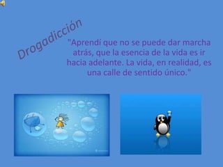 El documento habla sobre la vida y cómo no se puede retroceder, sino que hay que seguir avanzando hacia adelante. También menciona que la vida es una calle de sentido único.
