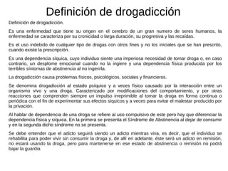 El documento discute la drogadicción en los adolescentes en América Latina y Chile. En América Latina, muchos jóvenes viven en zonas urbanas donde no todos tienen oportunidades laborales, lo que contribuye al consumo de drogas y problemas asociados como la delincuencia y la prostitución. En Chile, el consumo de sustancias tóxicas entre los adolescentes ha superado el promedio nacional y se ha convertido en una epidemia, siendo el principal problema de salud que afecta al país.