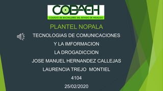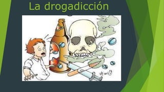 Este documento describe la drogadicción y sus efectos. Define la drogadicción como una enfermedad que causa dependencia de sustancias que afectan el sistema nervioso central. Luego describe varias drogas comunes como el cannabis, éxtasis, heroína, cocaína, anfetaminas y LSD. Explica las posibles causas de la drogadicción y las consecuencias negativas que puede tener el consumo de drogas como problemas de salud física y mental, problemas familiares y sociales, y adicción. Finalmente incluye testimonios