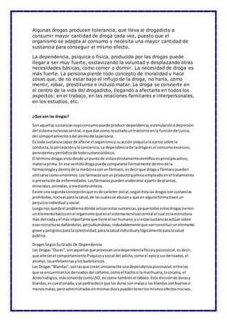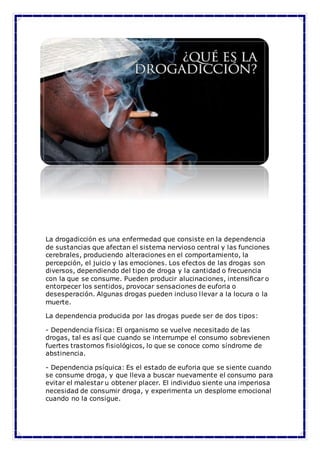 La drogadicción es una enfermedad que consiste en la dependencia de sustancias que afectan el sistema nervioso central. Las drogas pueden producir efectos como alucinaciones, cambios en las emociones y el comportamiento, e incluso la muerte. Existen dos tipos de dependencia - física y psíquica - que esclavizan la voluntad de la persona y afectan todos los aspectos de su vida.