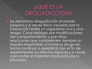 La adicción es una enfermedad primaria, progresiva y mortal que se caracteriza por la interacción entre un organismo y una droga que causa modificaciones de comportamiento y el impulso de consumir la droga de forma continua. Las drogas alteran las funciones corporales y la percepción e incluyen sustancias como alcohol, cafeína, cocaína, LSD, marihuana y opiáceos. La adicción tiene efectos negativos en la salud física y mental, las relaciones sociales y el trabajo. El tratamiento de la adic