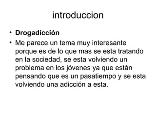 La drogadicción se está convirtiendo en un gran problema en la sociedad, especialmente entre los jóvenes que a menudo la ven como un pasatiempo sin darse cuenta de que puede conducir a una adicción. Este documento busca enseñar a los jóvenes sobre los daños que causa la drogadicción en el cuerpo, la reputación y la vida, además de explicar cómo tratar y curar la adicción.