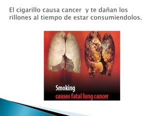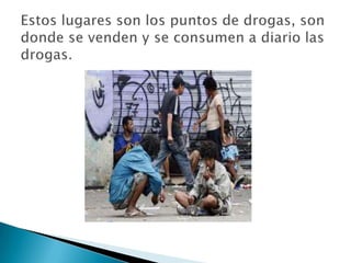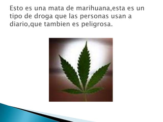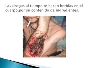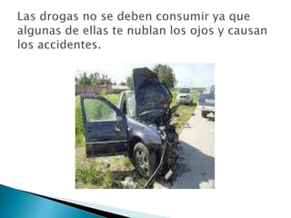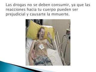 El documento habla sobre los peligros de las drogas y cómo pueden arruinar la vida de una persona al quitarles el amor, la vida y la libertad. Se recomienda no usar drogas para evitar las consecuencias negativas que pueden traer.