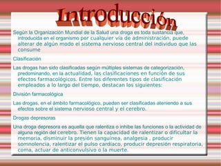 Las drogas alteran el comportamiento psicológico, físico y social de una persona, creando dependencia física y emocional. Existen diferentes tipos de drogas como la cocaína, marihuana y heroína, que se consumen de formas como oralmente, por inyección o fumando. El consumo de drogas genera efectos dañinos como adicción, ansiedad, presión alta y problemas de salud, por lo que su uso está prohibido.
