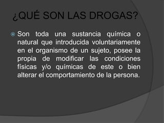 Este documento define las drogas como sustancias químicas o naturales que alteran los procesos físicos y químicos del cuerpo humano o modifican el comportamiento cuando se introducen voluntariamente. Explica los mecanismos de acción de las drogas, incluidos los términos de tolerancia, dependencia y abstinencia. Además, describe los efectos de varios tipos comunes de drogas como alcohol, inhalantes, barbitúricos, narcóticos, estimulantes y alucinógenos.