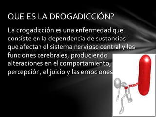 Este documento describe las drogas más comunes, sus efectos y consecuencias. Explica que la drogadicción es una enfermedad causada por la dependencia a sustancias que alteran el sistema nervioso. Las drogas pueden tener consecuencias físicas y psicológicas graves para el usuario y sus seres queridos. El tratamiento de la drogadicción busca ayudar al adicto a dejar el consumo compulsivo a través de diferentes enfoques y durante un proceso a largo plazo.