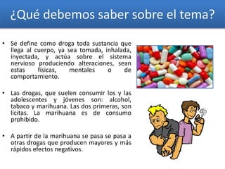 El documento aborda el concepto de drogas, su clasificación y los efectos nocivos que producen en los jóvenes, como alteraciones en el comportamiento y graves problemas de salud. Destaca el consumo de sustancias como alcohol, tabaco y marihuana, señalando su impacto en la vida social y familiar. Además, sugiere estrategias para prevenir el consumo de drogas, enfatizando la importancia de la comunicación familiar y la toma de decisiones personales.