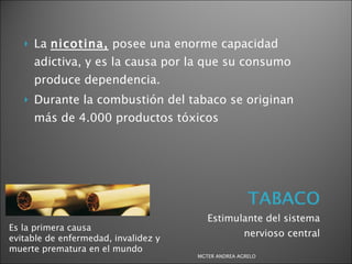 El documento analiza los efectos y riesgos de diversas drogas, incluyendo la nicotina, alcohol, cannabis, cocaína, heroína y estimulantes, destacando su capacidad adictiva y las graves consecuencias para la salud. Se detalla cómo estas sustancias afectan diferentes sistemas del cuerpo, provocando enfermedades y alteraciones psicológicas, así como su relación con comportamientos de riesgo. Se enfatiza la importancia de la prevención y la intervención temprana ante el consumo de drogas, especialmente en jóvenes.