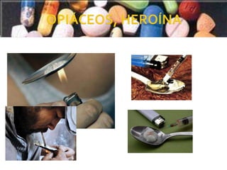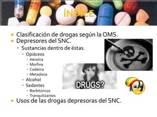 La OMS ha clasificado las drogas en tres grupos: depresores del SNC, estimulantes del SNC y perturbadoras del SNC. Los depresores del SNC incluyen opiáceos como heroína y morfina, alcohol y sedantes como barbitúricos y tranquilizantes. Estas sustancias disminuyen la función del cerebro y se usan con fines médicos, aunque también existen mercados ilegales. El abuso de depresores puede generar dependencia y adicción.