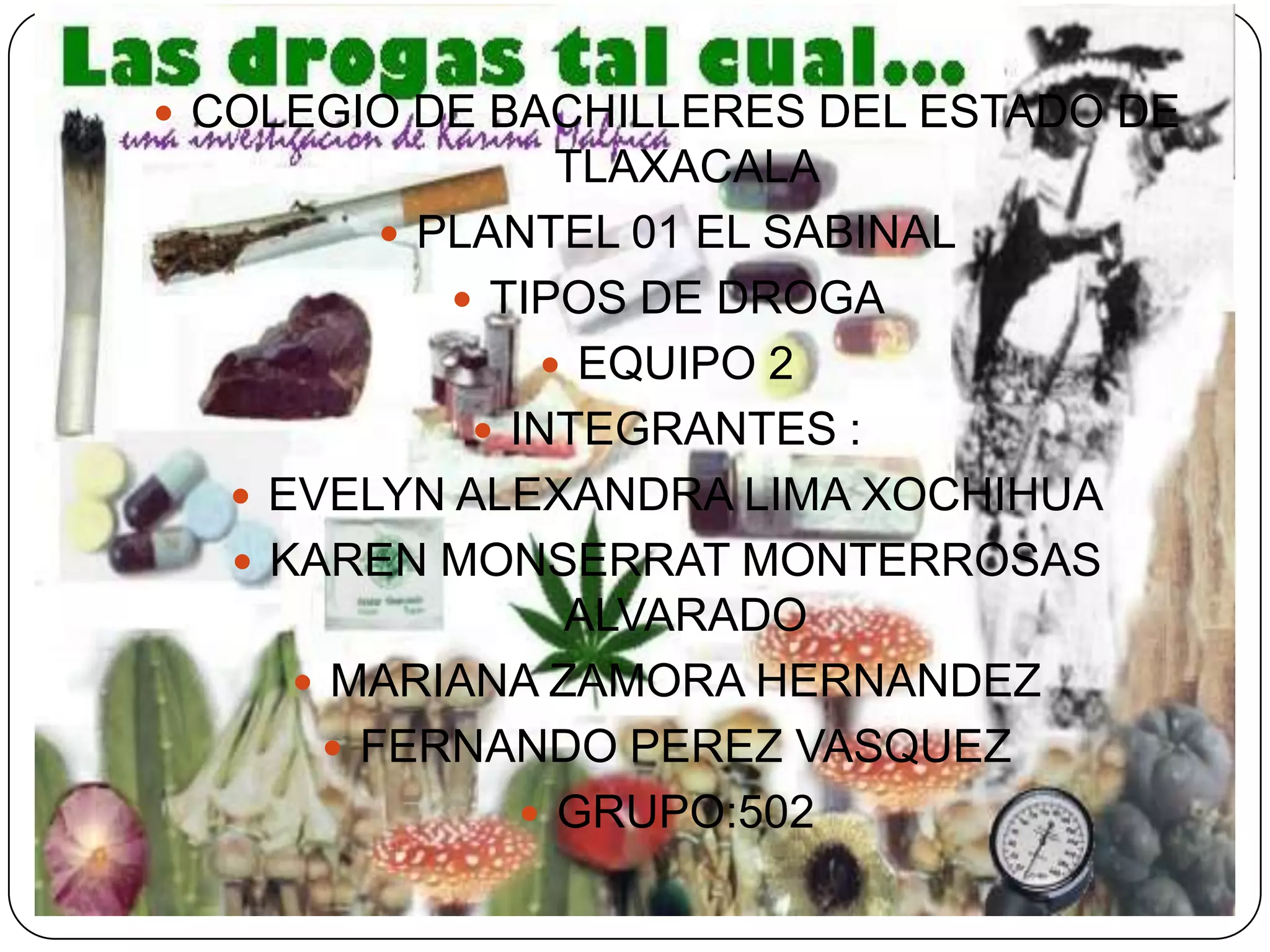 El documento presenta información sobre diferentes tipos de drogas, incluyendo drogas legales como el tabaco, el alcohol y los medicamentos, así como drogas ilegales como la marihuana, cocaína, anfetaminas y heroína. Describe brevemente cada droga, sus nombres comunes, cómo se consumen, sus efectos a corto plazo y los riesgos para la salud asociados con su uso a largo plazo.
