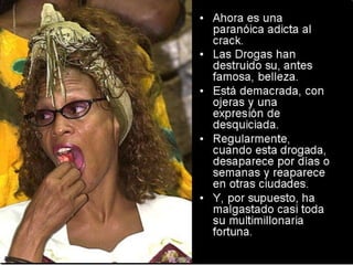 El documento habla sobre los efectos dañinos de las drogas a través del ejemplo de Whitney Houston y cómo las drogas pueden degradar, destruir y matar. Insta a la gente a informarse sobre los efectos de todas las drogas, incluidas las legales, y a combatir a los traficantes y propagadores de drogas para crear una sociedad libre de drogas.
