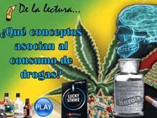 El documento clasifica y define los diferentes tipos y conceptos relacionados con el uso y abuso de drogas. Explica que las drogas pueden ser legales o ilegales y cubre temas como la tolerancia, dependencia, síndrome de abstinencia, factores de riesgo y protección, así como las etapas de consumo y clasificación de drogas.