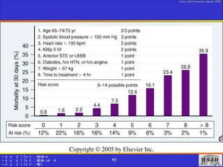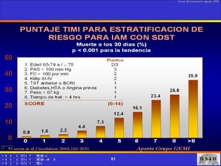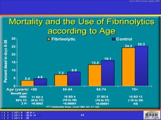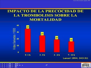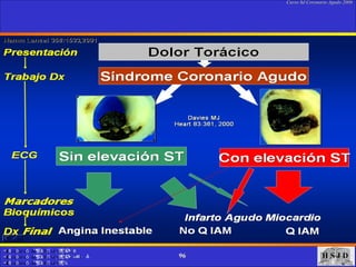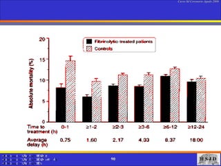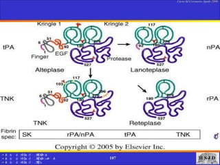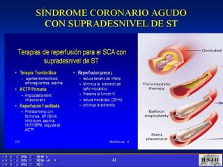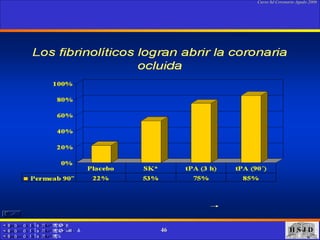 Este documento describe diferentes drogas vasoactivas utilizadas en el tratamiento del shock, incluyendo epinefrina, norepinefrina, dopamina, dobutamina, amrinona e isoproterenol. Explica sus mecanismos de acción, dosis y presentaciones. También resume la epidemiología del infarto agudo de miocardio en Chile y recomendaciones de tratamiento como trombolisis, angioplastia primaria y medicamentos coadyuvantes.