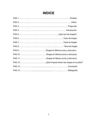 Este documento trata sobre el impacto de las principales drogas manejadas por el narcotráfico en México en la salud de los jóvenes. Describe la composición química, estructura y efectos de drogas como la metanfetamina, cocaína, marihuana, heroína y éxtasis. El documento analiza cada droga detallando su fórmula química, nombre científico y cómo afectan al sistema nervioso central, creando dependencia y tolerancia. El objetivo final es dar propuestas para prevenir los efect