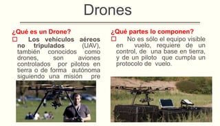 Los drones, o vehículos aéreos no tripulados, son utilizados en diversas aplicaciones civiles y militares, siendo controlados desde tierra o de manera autónoma. Con la percepción pública marcada por confusiones sobre su uso y peligrosidad, su futuro incluye el desarrollo de drones más ligeros y avanzados para tareas como búsqueda y fotografía. En Perú, los desafíos para su implementación incluyen la aceptación social, normativas de seguridad y la regulación legal vigente.