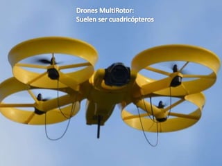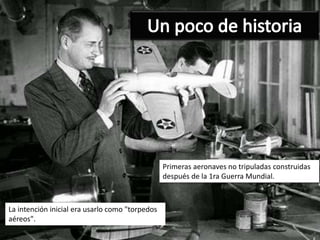 El documento aborda la evolución de las aeronaves no tripuladas, destacando su origen como 'torpedos aéreos' después de la Primera Guerra Mundial y su clasificación en drones militares, civiles y comerciales. Se detalla el funcionamiento del DJI Phantom 2 Vision +, incluyendo su tecnología GPS y componentes clave como motores brushless y baterías LiPo. Finalmente, enfatiza la importancia de comprender y desarrollar esta tecnología en la vida cotidiana y en el futuro de la ingeniería.