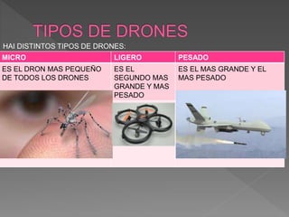 Hay tres tipos principales de drones: micro, ligero y pesado. El micro es el más pequeño y lo usan algunos militares, el ligero es típicamente para práctica o regalos, y el pesado es el más grande y lo usan los militares para ataques.