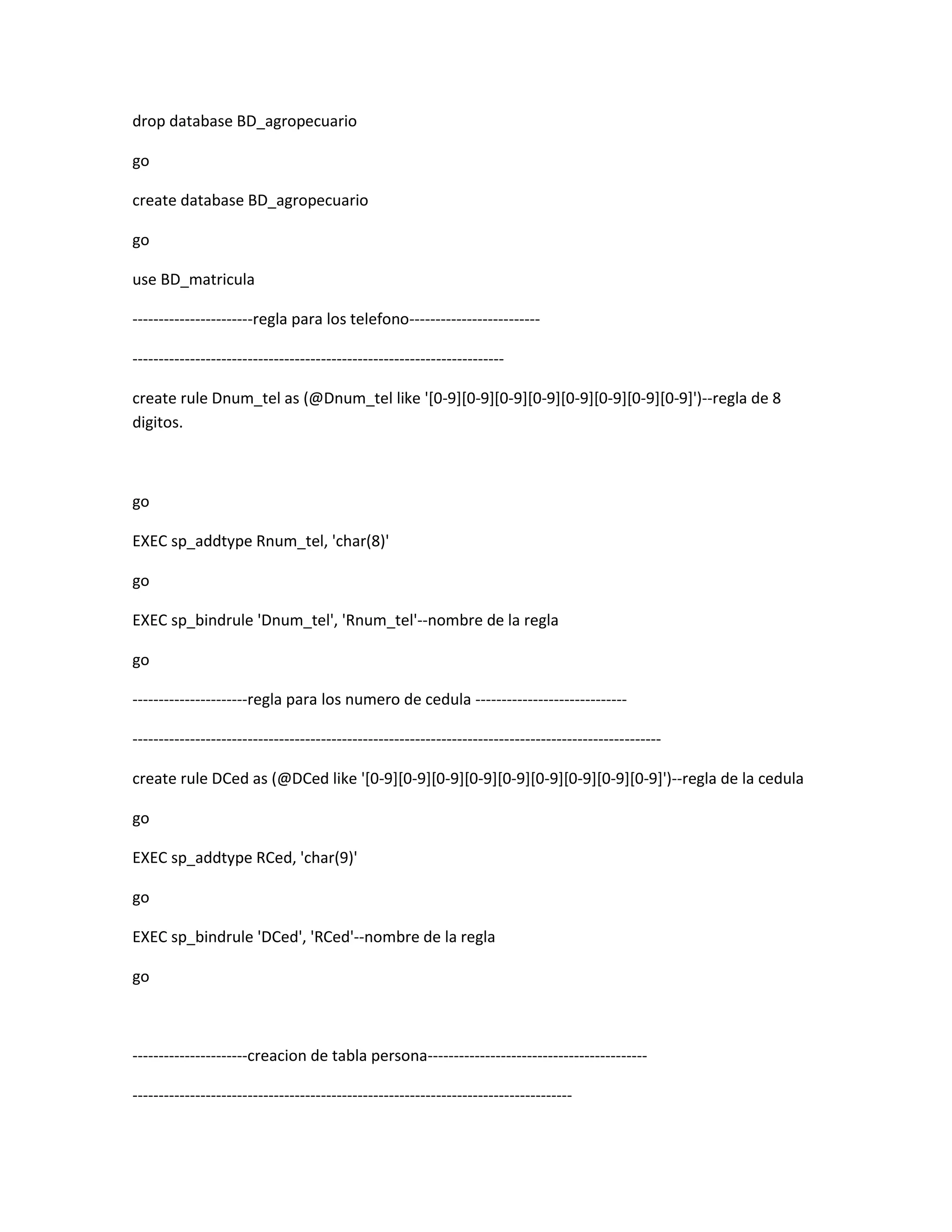 El documento describe la creación de una base de datos llamada BD_agropecuario. Se definen varias tablas y reglas para almacenar datos de personas, estudiantes, padres, teléfonos, instituciones educativas y más. También se crean procedimientos para insertar registros en las tablas de personas, familiares y teléfonos, con el fin de normalizar y relacionar la información almacenada.