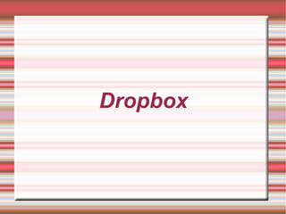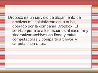 Dropbox es un servicio en la nube que permite a los usuarios almacenar, sincronizar y compartir archivos entre dispositivos. Los usuarios pueden dejar archivos en una carpeta especial que se sincroniza automáticamente con la nube y otras computadoras con Dropbox instalado, y también pueden compartir archivos con otros usuarios o accederlos desde el sitio web. Dropbox mantiene versiones anteriores de los archivos para que los usuarios puedan editarlos sin riesgo de perder cambios.