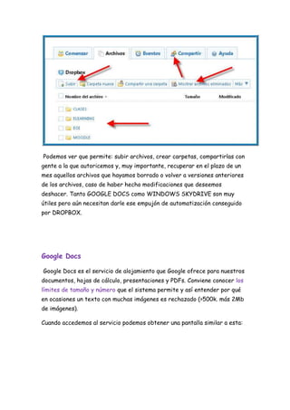 Dropbox es un servicio gratuito de almacenamiento en la nube de hasta 2 GB que sincroniza automáticamente los archivos entre dispositivos. Permite tener los archivos perfectamente sincronizados entre ordenadores personales y acceder a ellos desde cualquier lugar a través de Internet. Google Docs permite subir y compartir documentos, hojas de cálculo y presentaciones en la nube para editarlos de forma colaborativa.