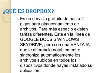 Dropbox es un servicio gratuito de almacenamiento en la nube de hasta 2 GB que permite sincronizar automáticamente archivos entre dispositivos. Se utiliza principalmente para mantener los archivos personales sincronizados entre computadoras de manera que siempre se tenga acceso a la versión más reciente desde cualquier lugar con acceso a Internet. Dropbox también ofrece planes de pago para obtener más espacio de almacenamiento hasta 100 GB.