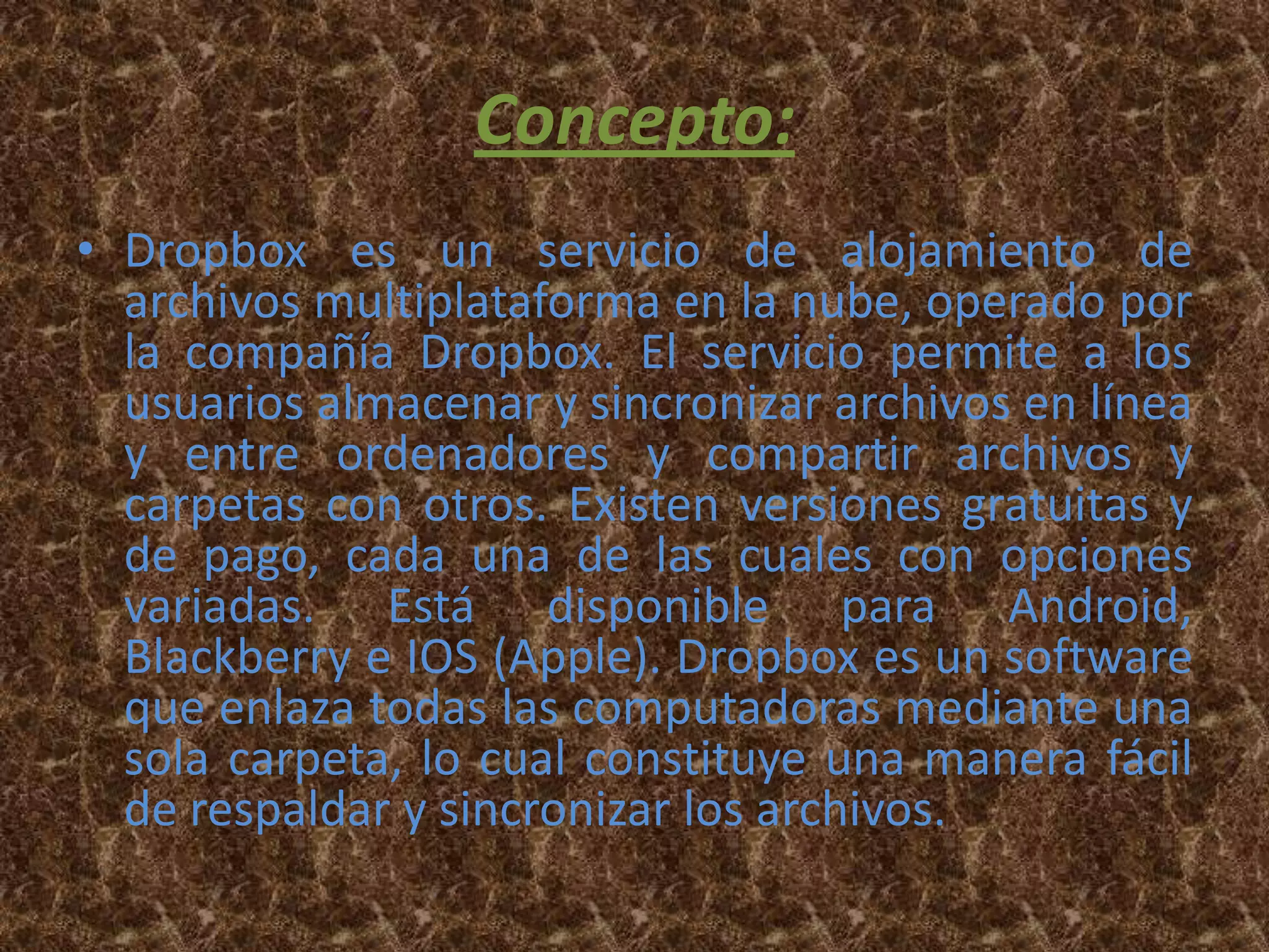 Dropbox es un servicio de almacenamiento y sincronización en la nube que permite a los usuarios almacenar archivos en una carpeta especial y acceder a ellos desde cualquier dispositivo, manteniendo siempre la versión más reciente en todos los dispositivos. El servicio también ofrece funciones como compartir archivos, recuperar versiones anteriores de los archivos y sincronizar automáticamente los cambios entre dispositivos.